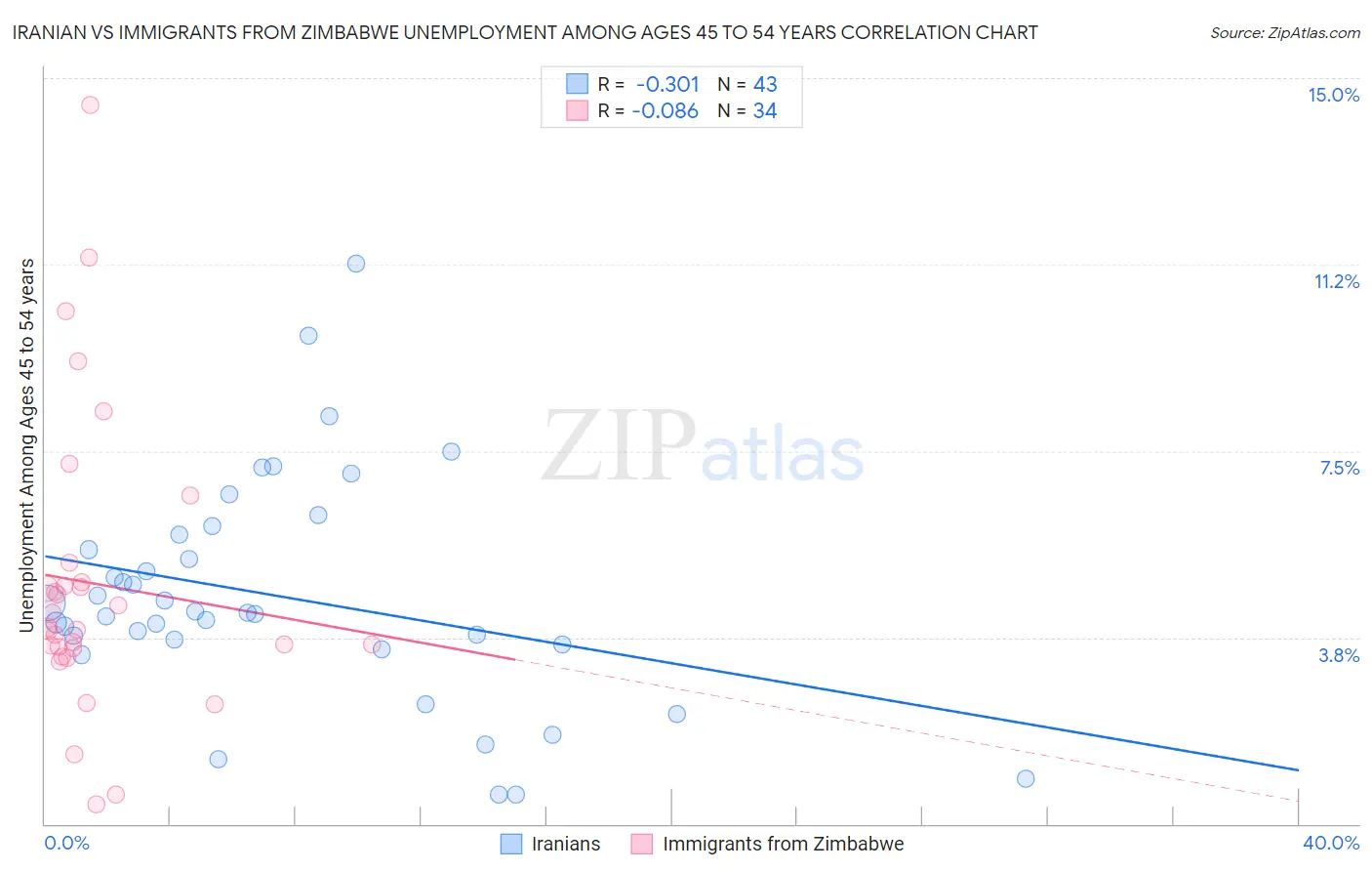 Iranian vs Immigrants from Zimbabwe Unemployment Among Ages 45 to 54 years Correlation Chart