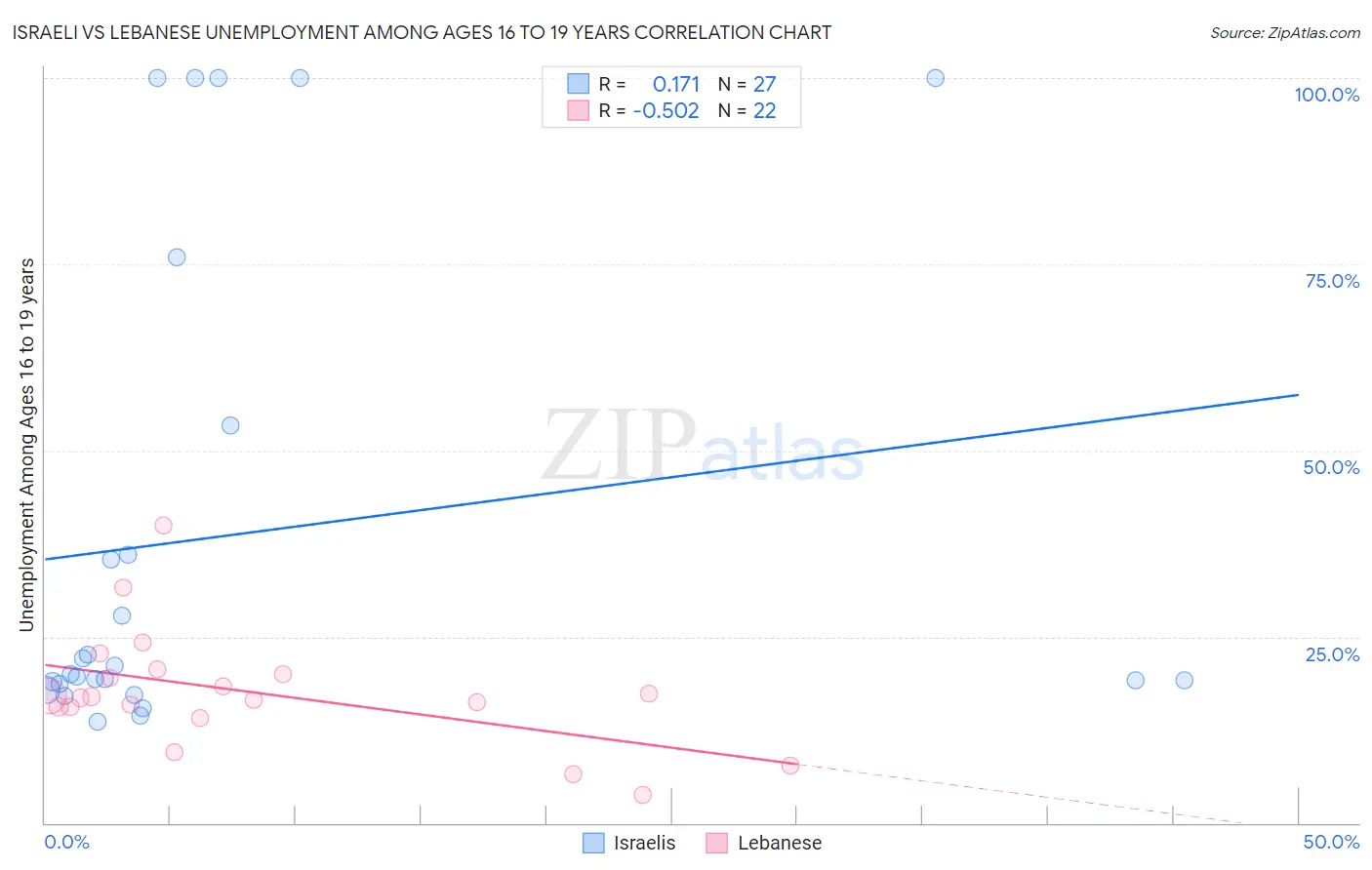 The statistical analysis conducted on geographies consisting of 204,167,490 people shows a poor positive correlation between the proportion of Israelis and unemployment rate among population between the ages 16 and 19 in the United States with a correlation coefficient (R) of 0.171 and weighted average of 19.0%. Similarly, the statistical analysis conducted on geographies consisting of 379,959,035 people shows a substantial negative correlation between the proportion of Lebanese and unemployment rate among population between the ages 16 and 19 in the United States with a correlation coefficient (R) of -0.502 and weighted average of 16.4%, a difference of 16.0%.