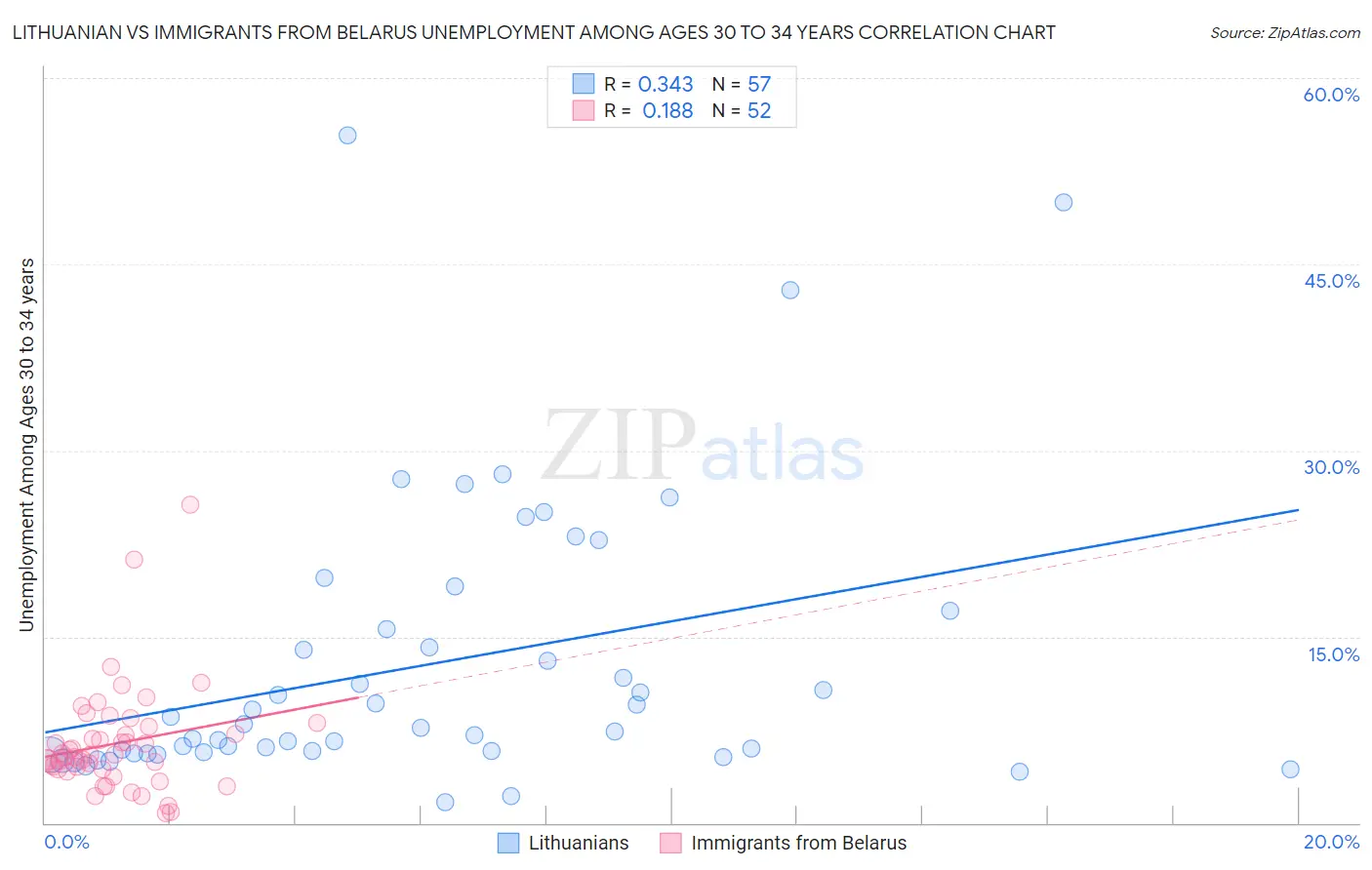 Lithuanian vs Immigrants from Belarus Unemployment Among Ages 30 to 34 years Correlation Chart