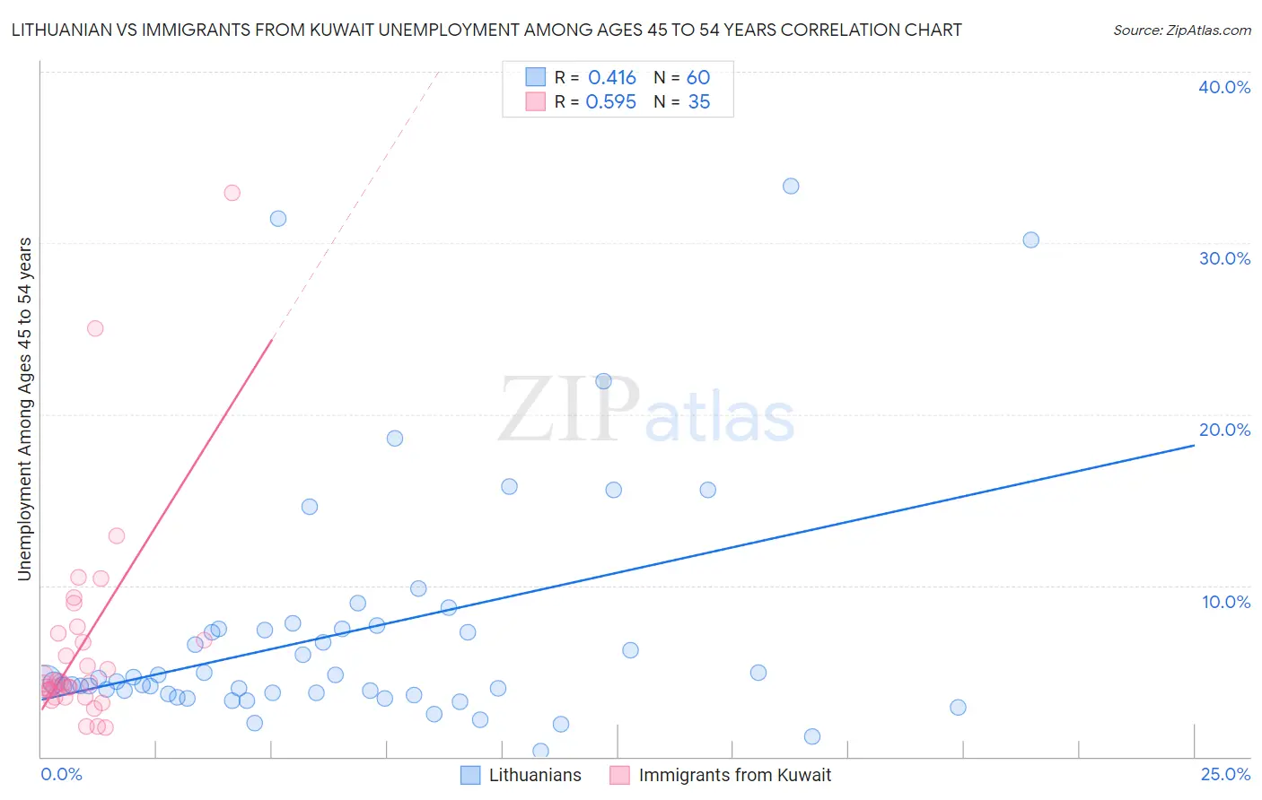 Lithuanian vs Immigrants from Kuwait Unemployment Among Ages 45 to 54 years Correlation Chart