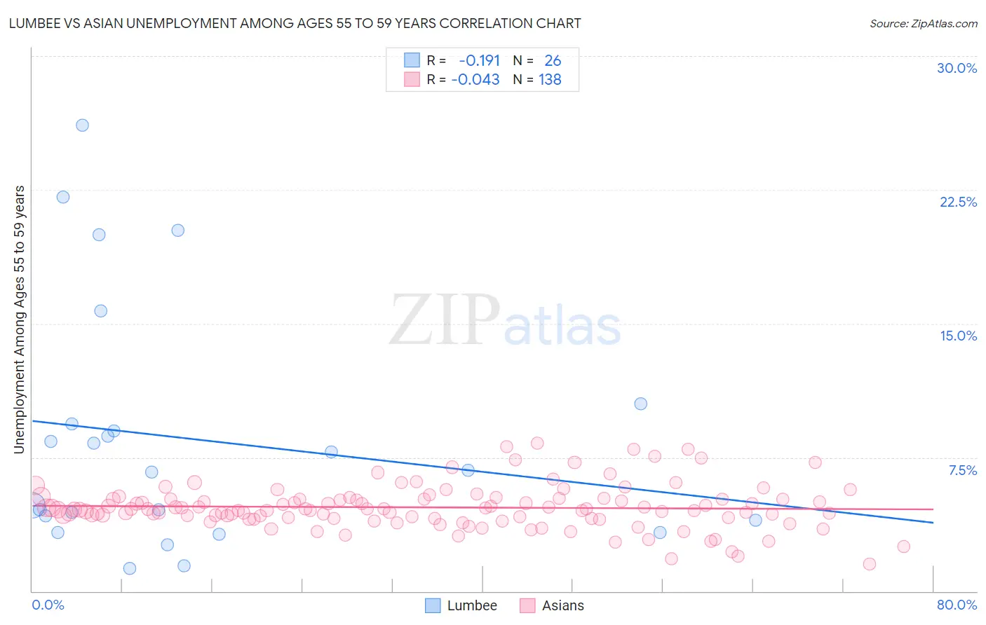 Lumbee vs Asian Unemployment Among Ages 55 to 59 years