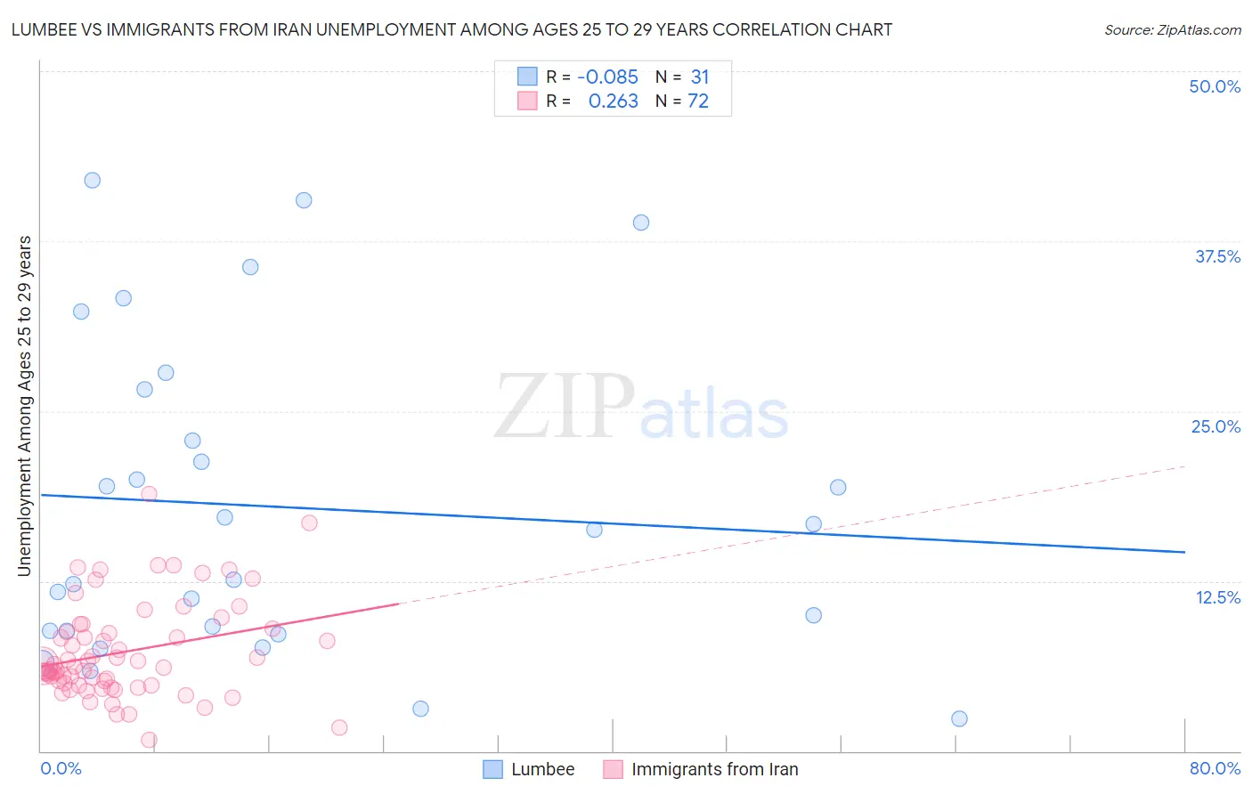 Lumbee vs Immigrants from Iran Unemployment Among Ages 25 to 29 years Correlation Chart