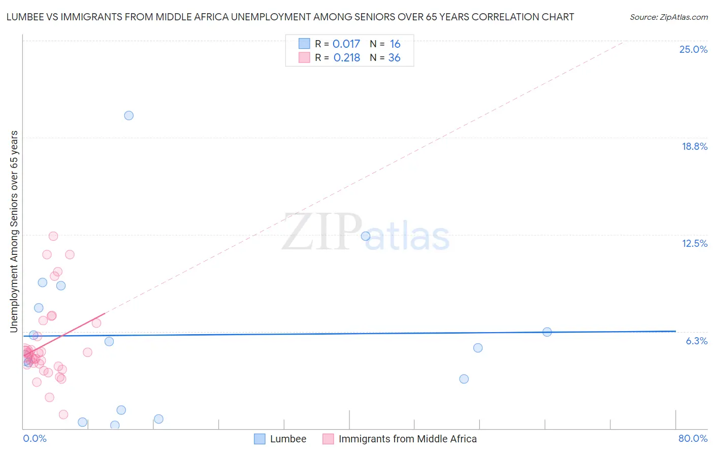Lumbee vs Immigrants from Middle Africa Unemployment Among Seniors over 65 years Correlation Chart