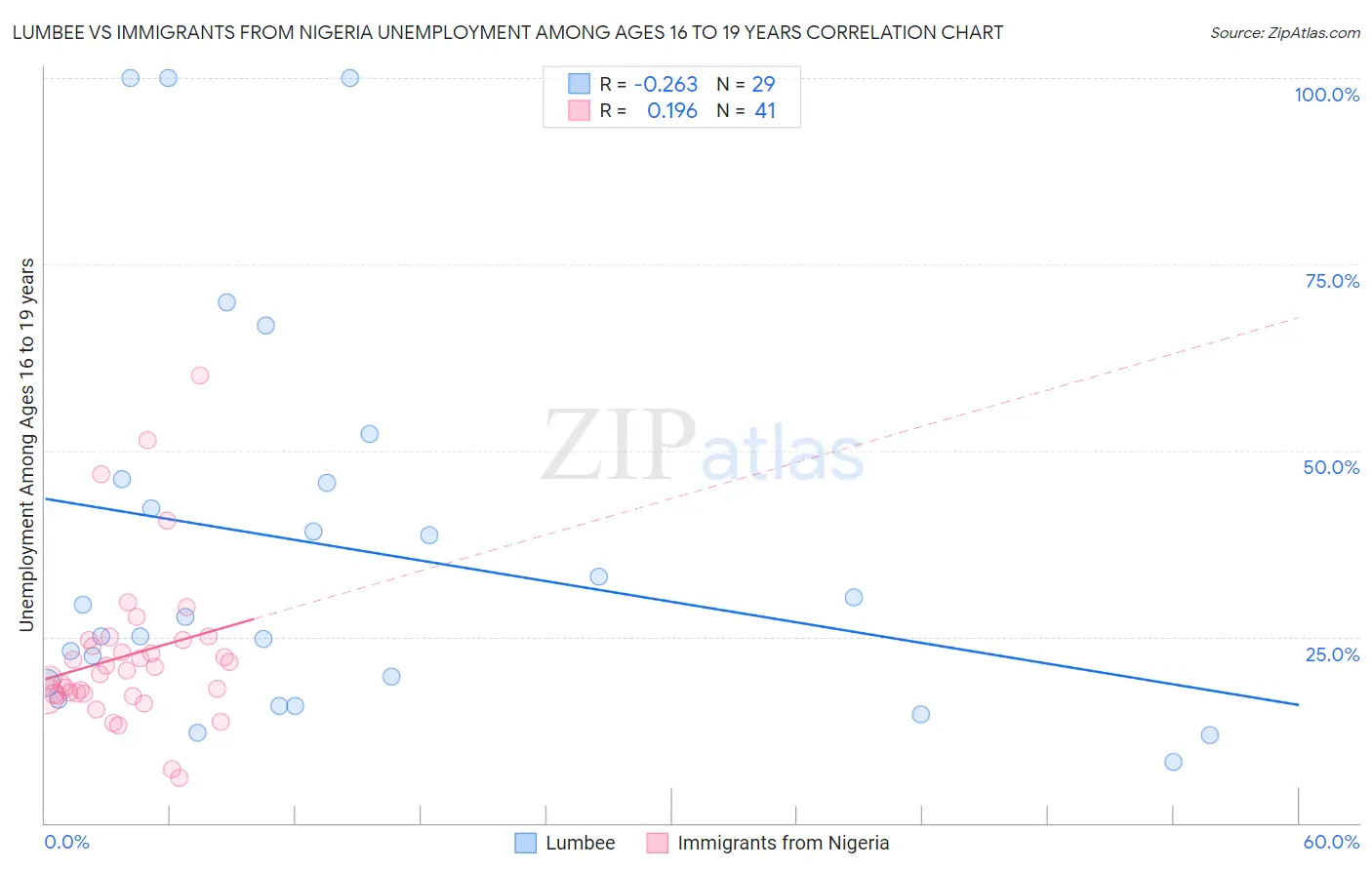 Lumbee vs Immigrants from Nigeria Unemployment Among Ages 16 to 19 years Correlation Chart