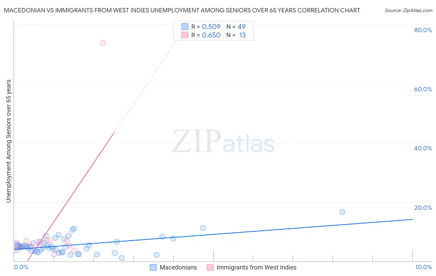 Macedonian vs Immigrants from West Indies Unemployment Among Seniors over 65 years Correlation Chart