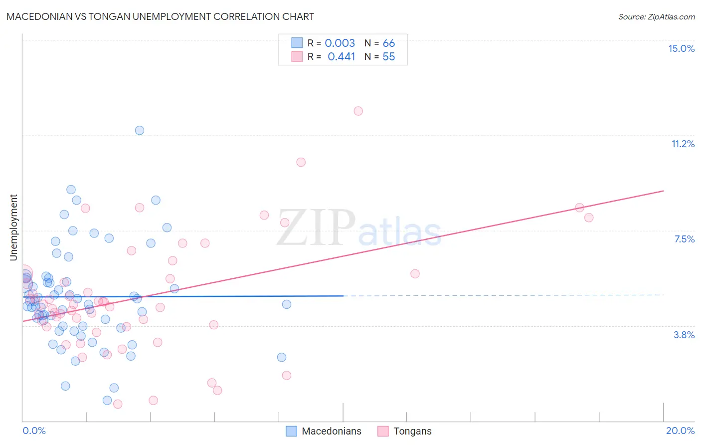 The statistical analysis conducted on geographies consisting of 132,628,728 people shows no correlation between the proportion of Macedonians and unemployment in the United States with a correlation coefficient (R) of 0.003 and weighted average of 5.1%. Similarly, the statistical analysis conducted on geographies consisting of 102,862,853 people shows a moderate positive correlation between the proportion of Tongans and unemployment in the United States with a correlation coefficient (R) of 0.441 and weighted average of 4.8%, a difference of 6.4%.