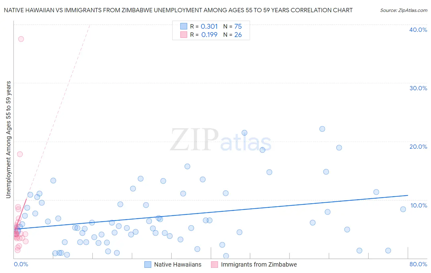 Native Hawaiian vs Immigrants from Zimbabwe Unemployment Among Ages 55 to 59 years Correlation Chart