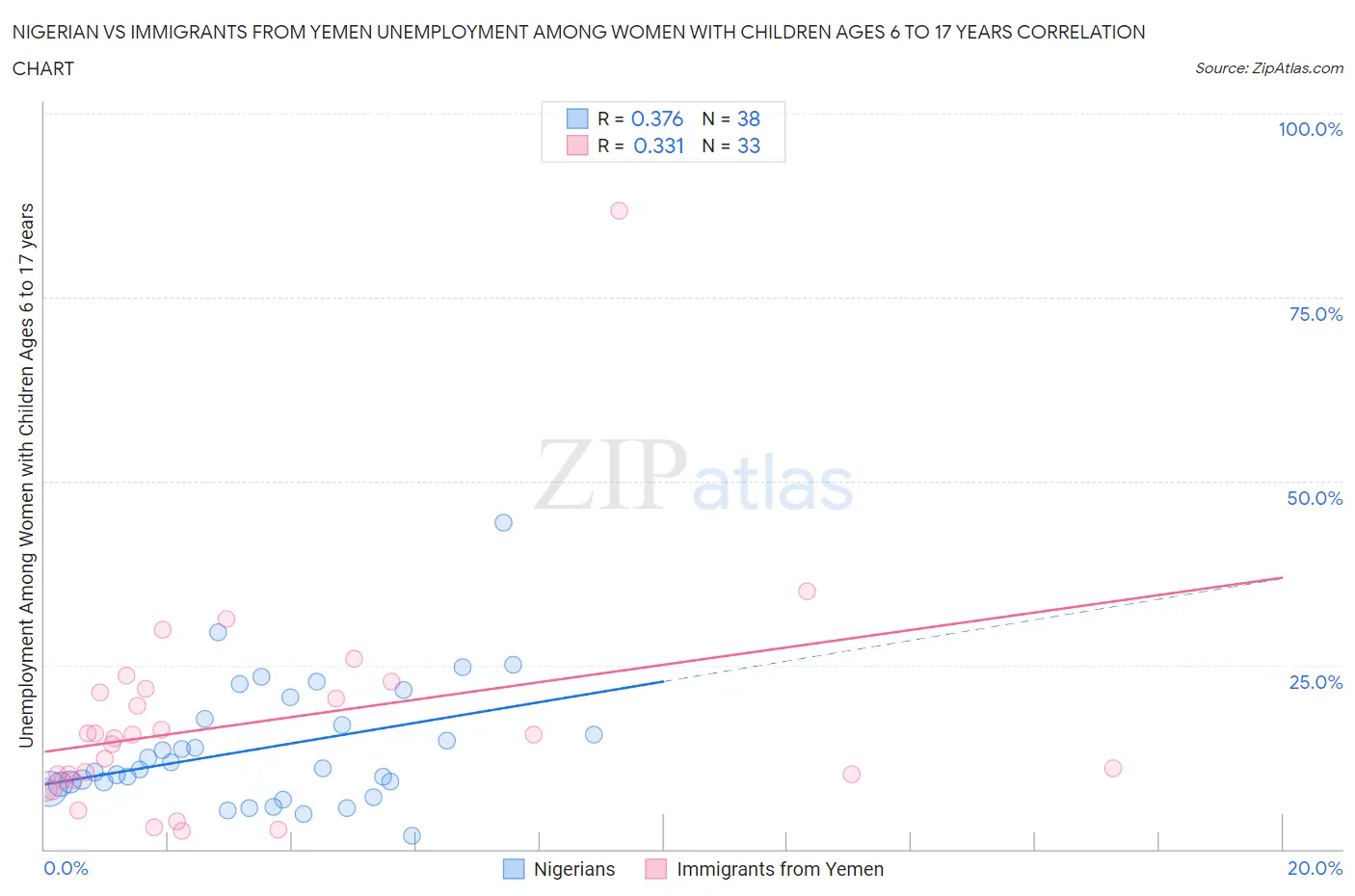 Nigerian vs Immigrants from Yemen Unemployment Among Women with Children Ages 6 to 17 years Correlation Chart