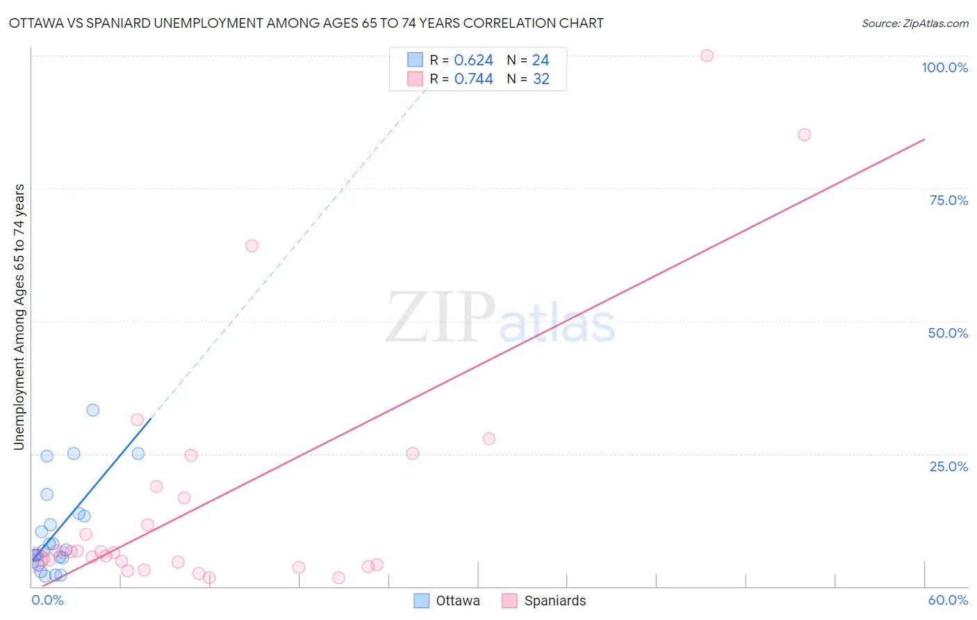 Ottawa vs Spaniard Unemployment Among Ages 65 to 74 years