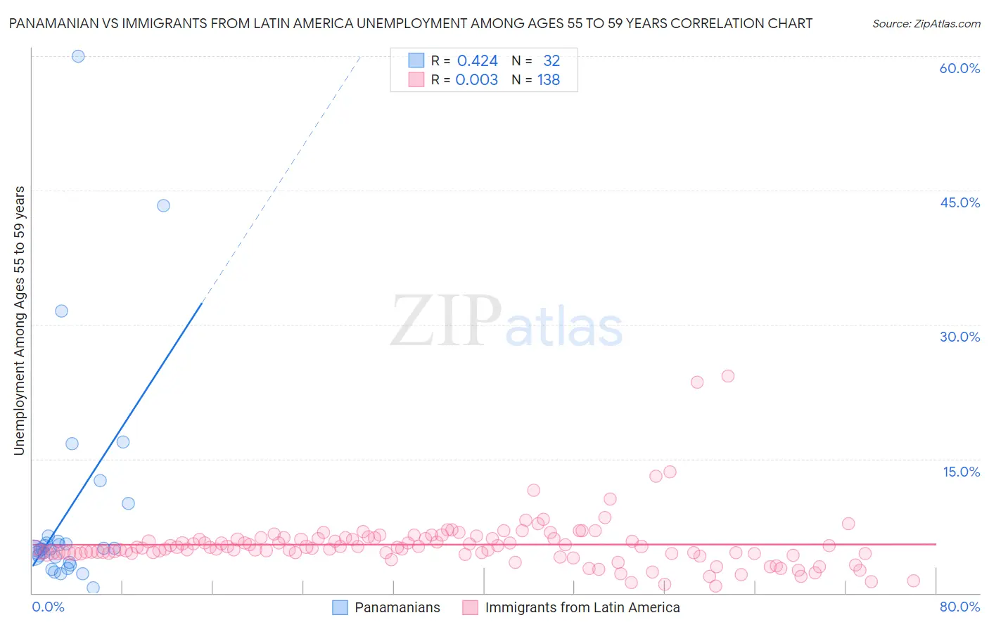 Panamanian vs Immigrants from Latin America Unemployment Among Ages 55 to 59 years Correlation Chart