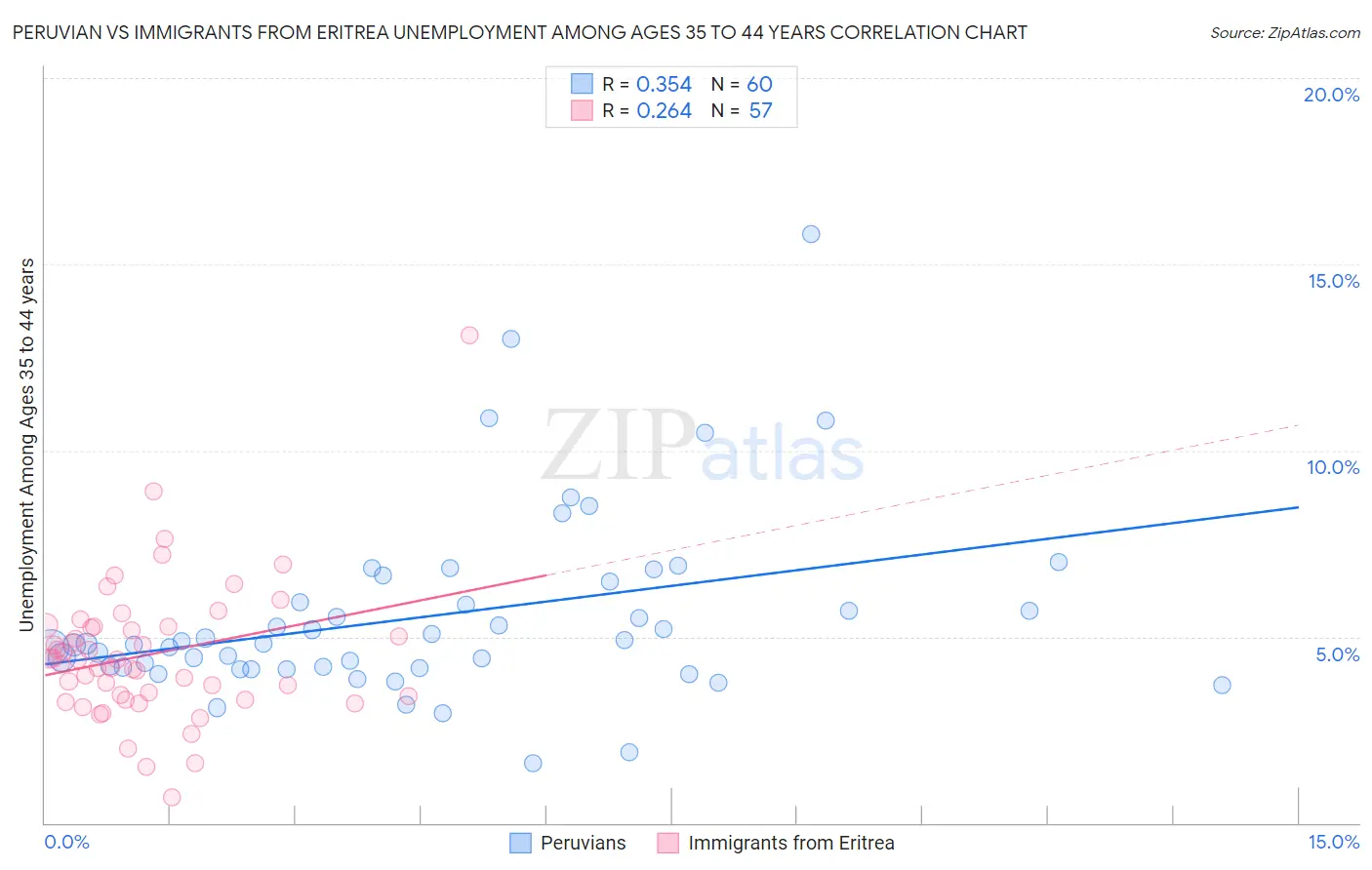 Peruvian vs Immigrants from Eritrea Unemployment Among Ages 35 to 44 years Correlation Chart
