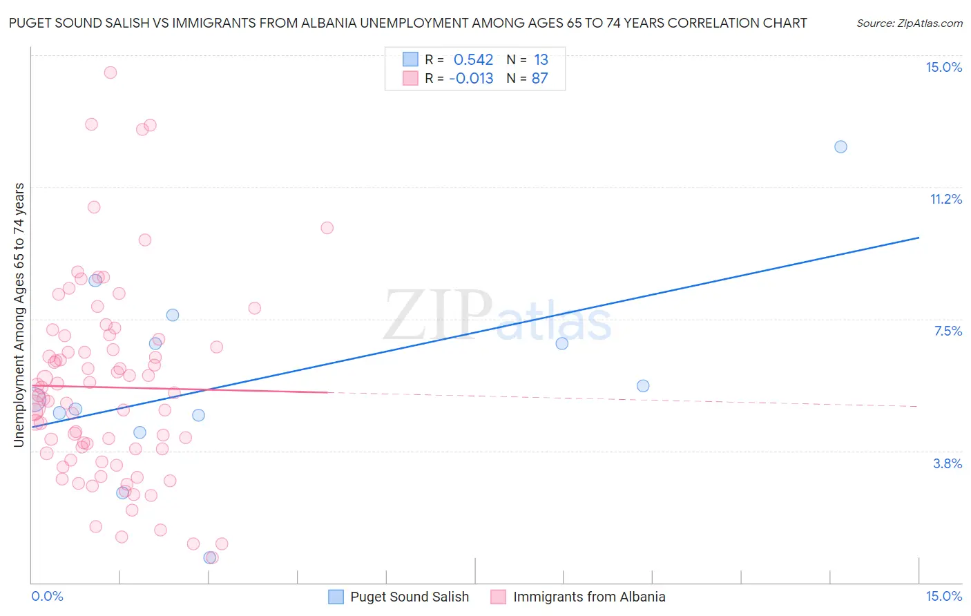 Puget Sound Salish vs Immigrants from Albania Unemployment Among Ages 65 to 74 years Correlation Chart