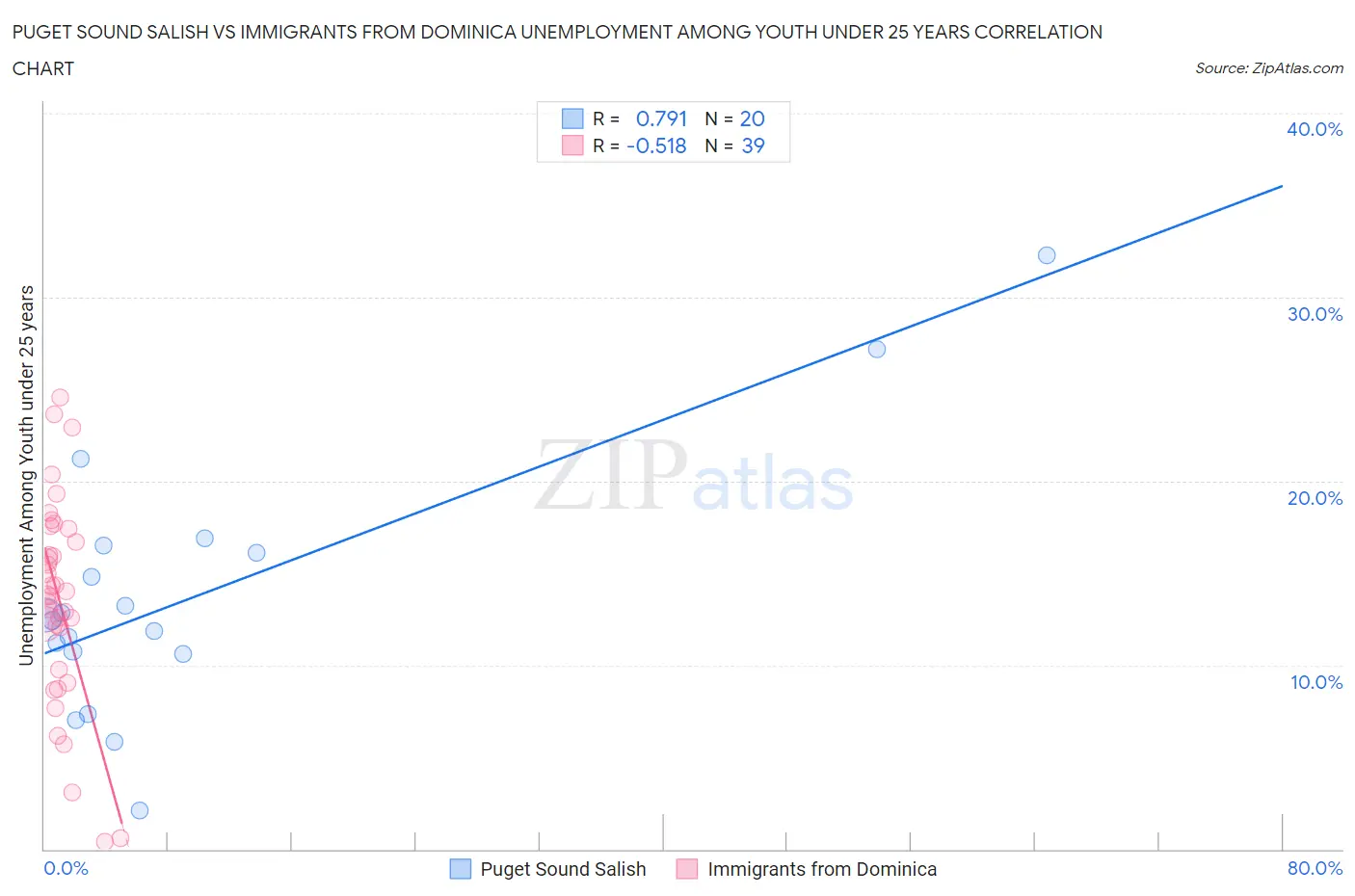 Puget Sound Salish vs Immigrants from Dominica Unemployment Among Youth under 25 years Correlation Chart