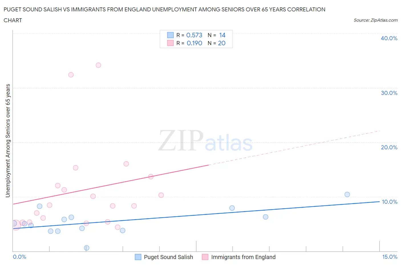 Puget Sound Salish vs Immigrants from England Unemployment Among Seniors over 65 years Correlation Chart