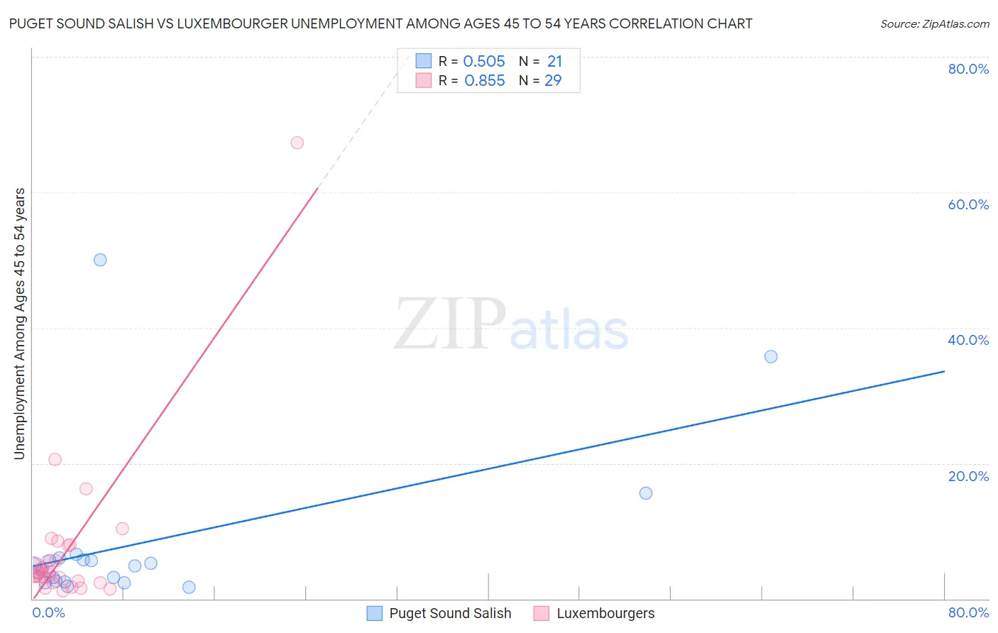 Puget Sound Salish vs Luxembourger Unemployment Among Ages 45 to 54 years Correlation Chart
