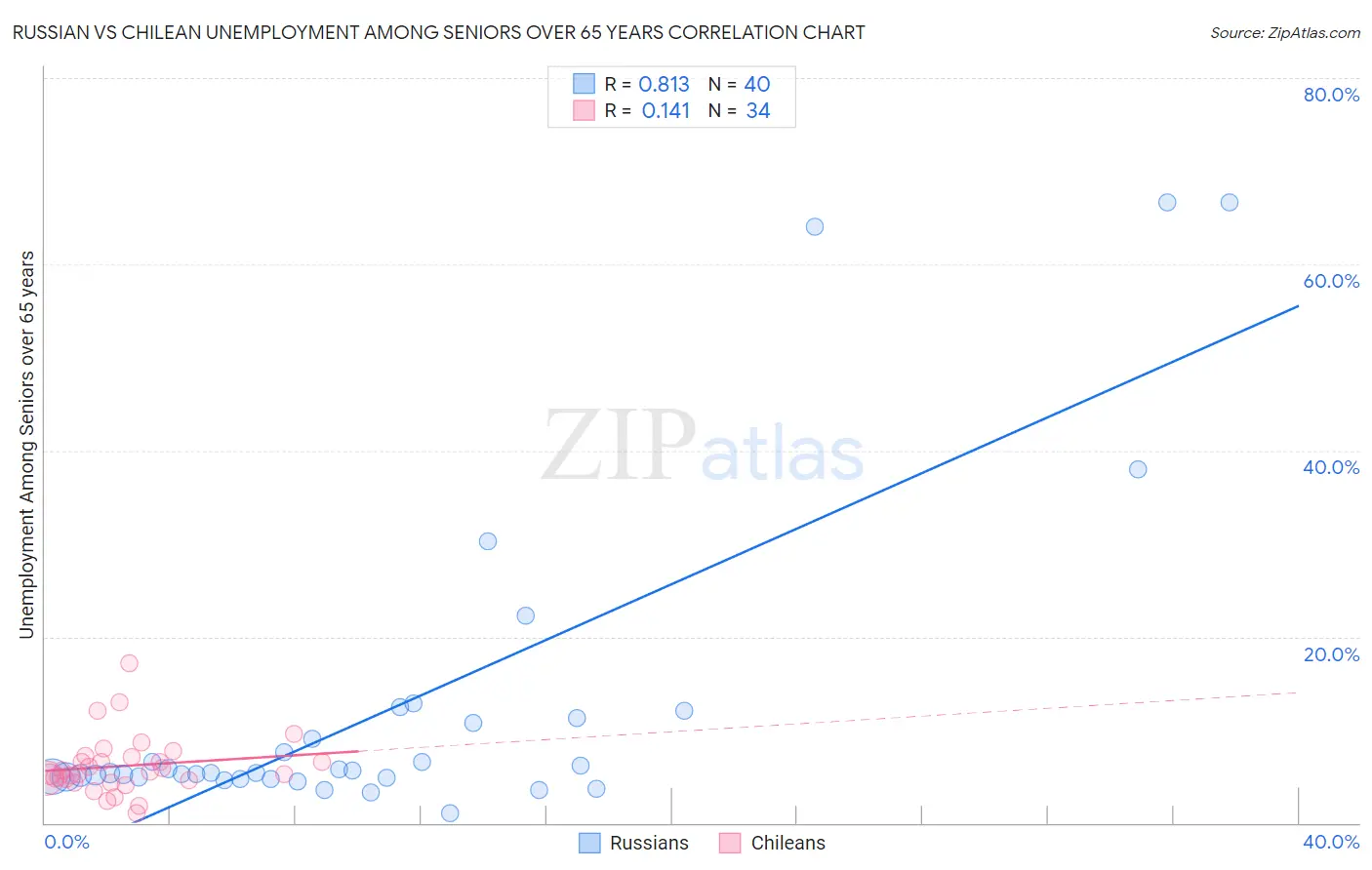 The statistical analysis conducted on geographies consisting of 434,877,249 people shows a very strong positive correlation between the proportion of Russians and unemployment rate amomg seniors over the age of 65 in the United States with a correlation coefficient (R) of 0.813 and weighted average of 5.2%. Similarly, the statistical analysis conducted on geographies consisting of 242,211,258 people shows a poor positive correlation between the proportion of Chileans and unemployment rate amomg seniors over the age of 65 in the United States with a correlation coefficient (R) of 0.141 and weighted average of 5.1%, a difference of 1.7%.