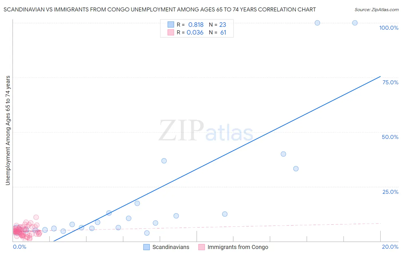 Scandinavian vs Immigrants from Congo Unemployment Among Ages 65 to 74 years Correlation Chart