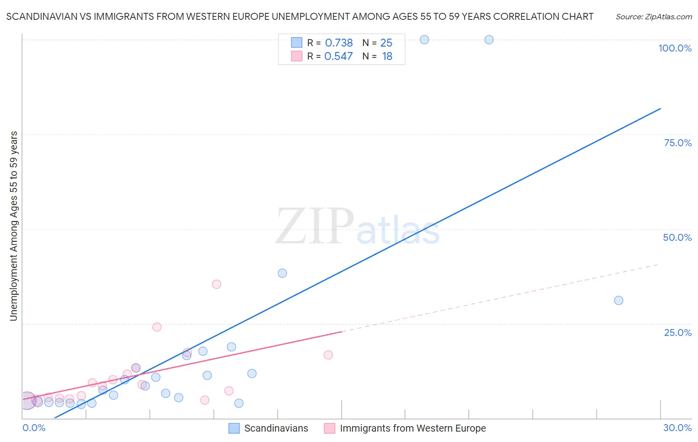 Scandinavian vs Immigrants from Western Europe Unemployment Among Ages 55 to 59 years Correlation Chart