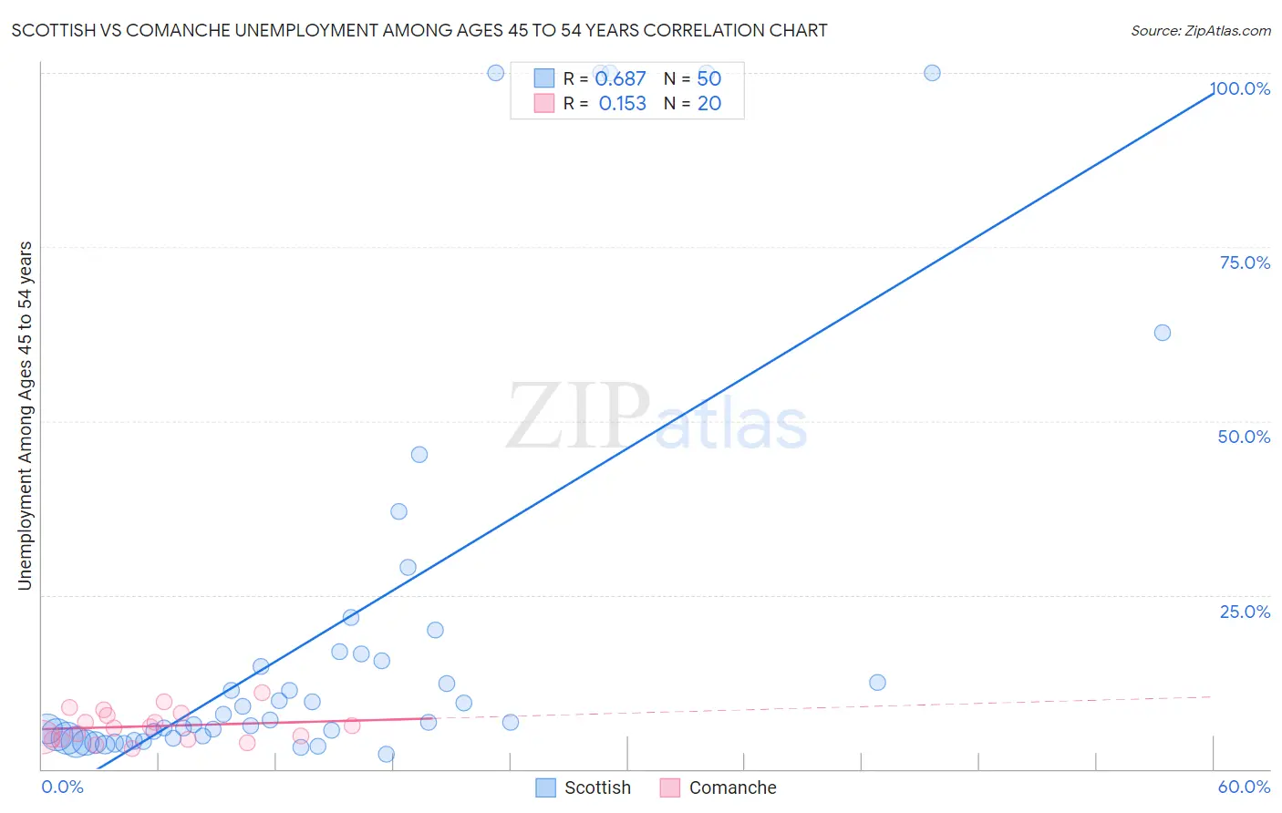 Scottish vs Comanche Unemployment Among Ages 45 to 54 years Correlation Chart