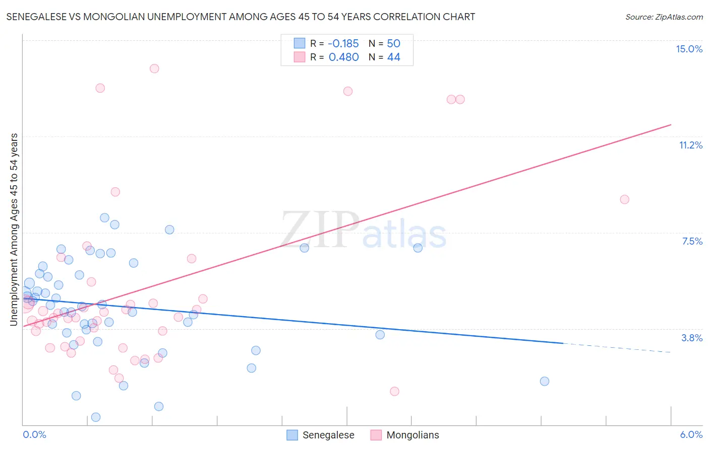 Senegalese vs Mongolian Unemployment Among Ages 45 to 54 years Correlation Chart