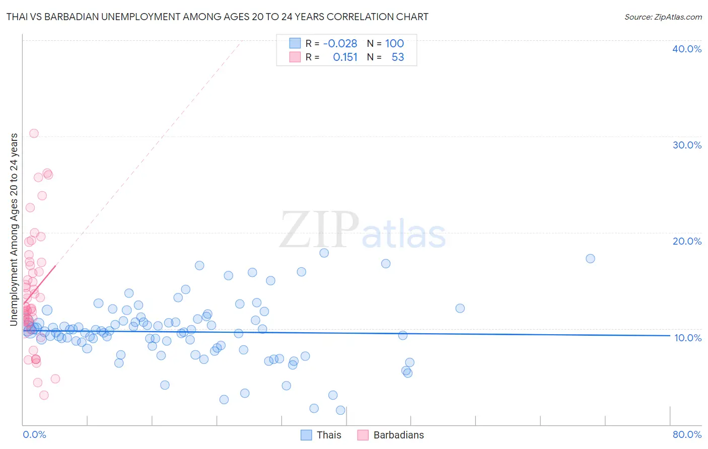 Thai vs Barbadian Unemployment Among Ages 20 to 24 years Correlation Chart