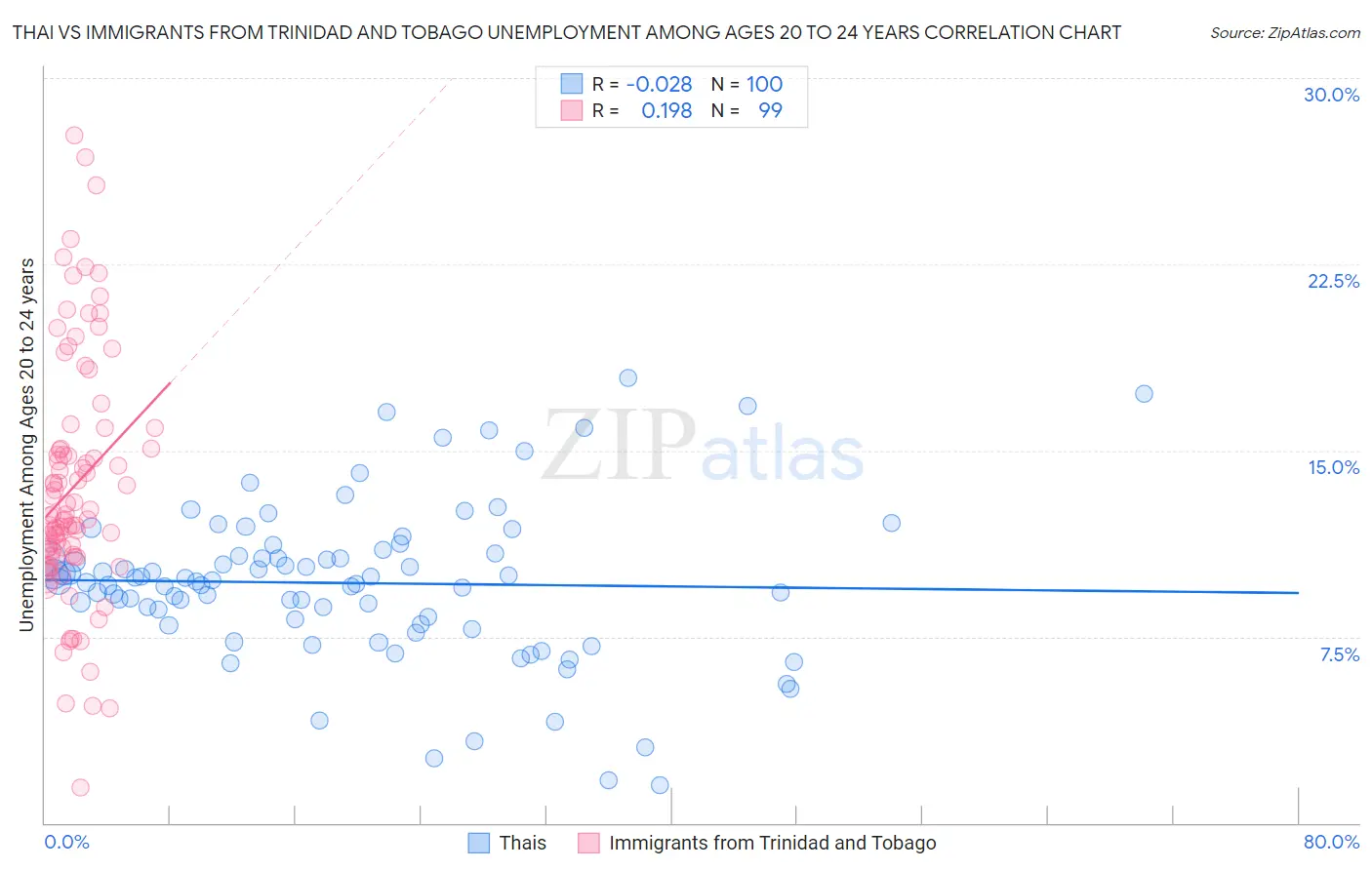 Thai vs Immigrants from Trinidad and Tobago Unemployment Among Ages 20 to 24 years Correlation Chart