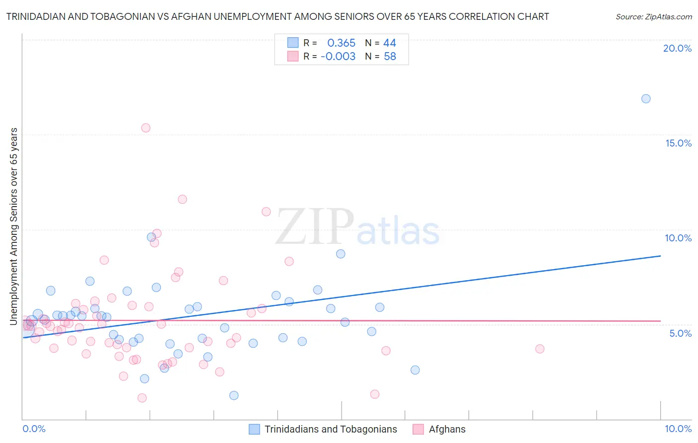 Trinidadian and Tobagonian vs Afghan Unemployment Among Seniors over 65 years Correlation Chart