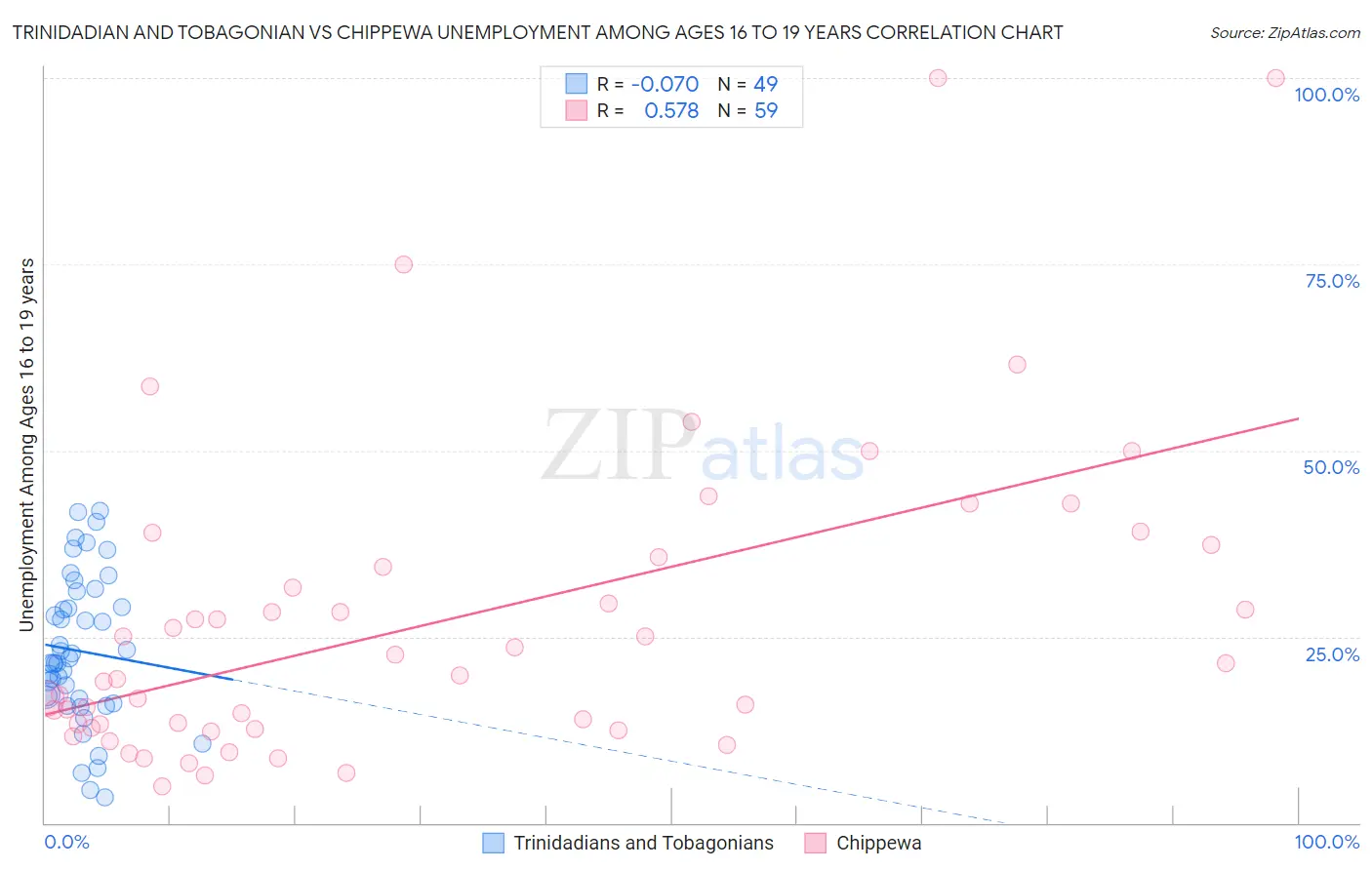 Trinidadian and Tobagonian vs Chippewa Unemployment Among Ages 16 to 19 years Correlation Chart
