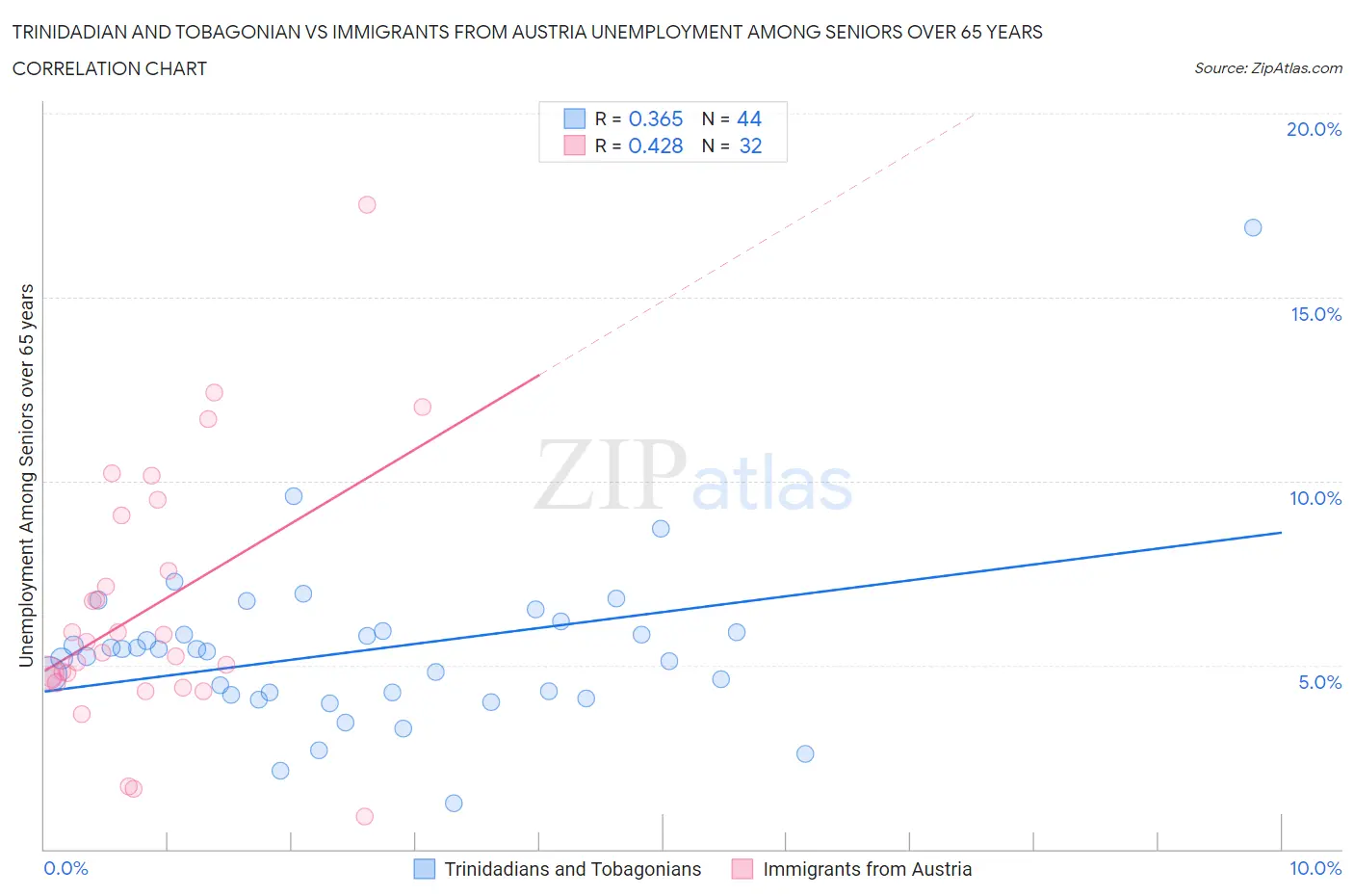 Trinidadian and Tobagonian vs Immigrants from Austria Unemployment Among Seniors over 65 years Correlation Chart