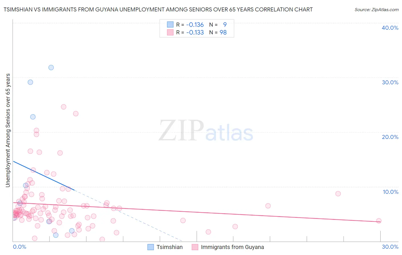 Tsimshian vs Immigrants from Guyana Unemployment Among Seniors over 65 years Correlation Chart