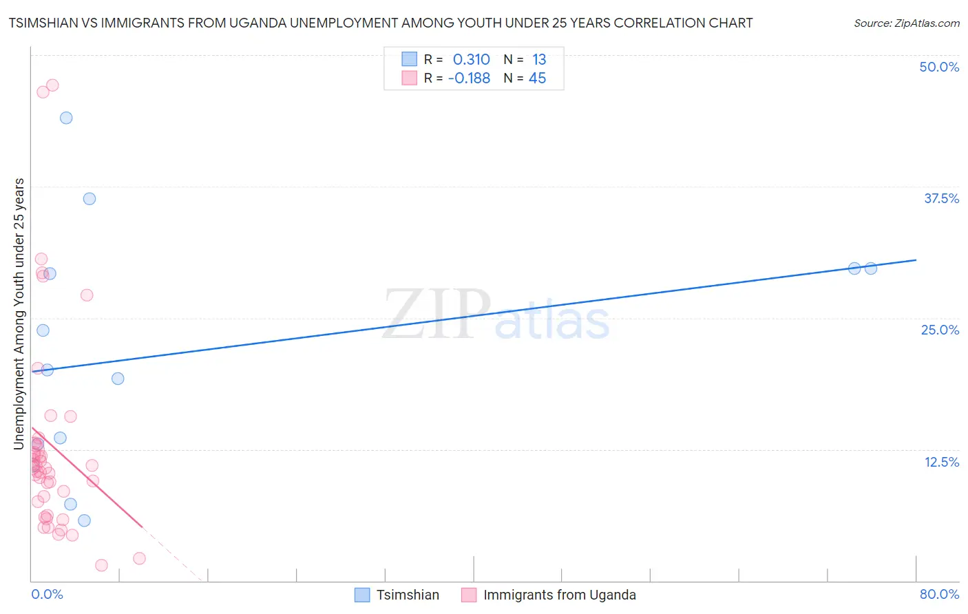 Tsimshian vs Immigrants from Uganda Unemployment Among Youth under 25 years Correlation Chart