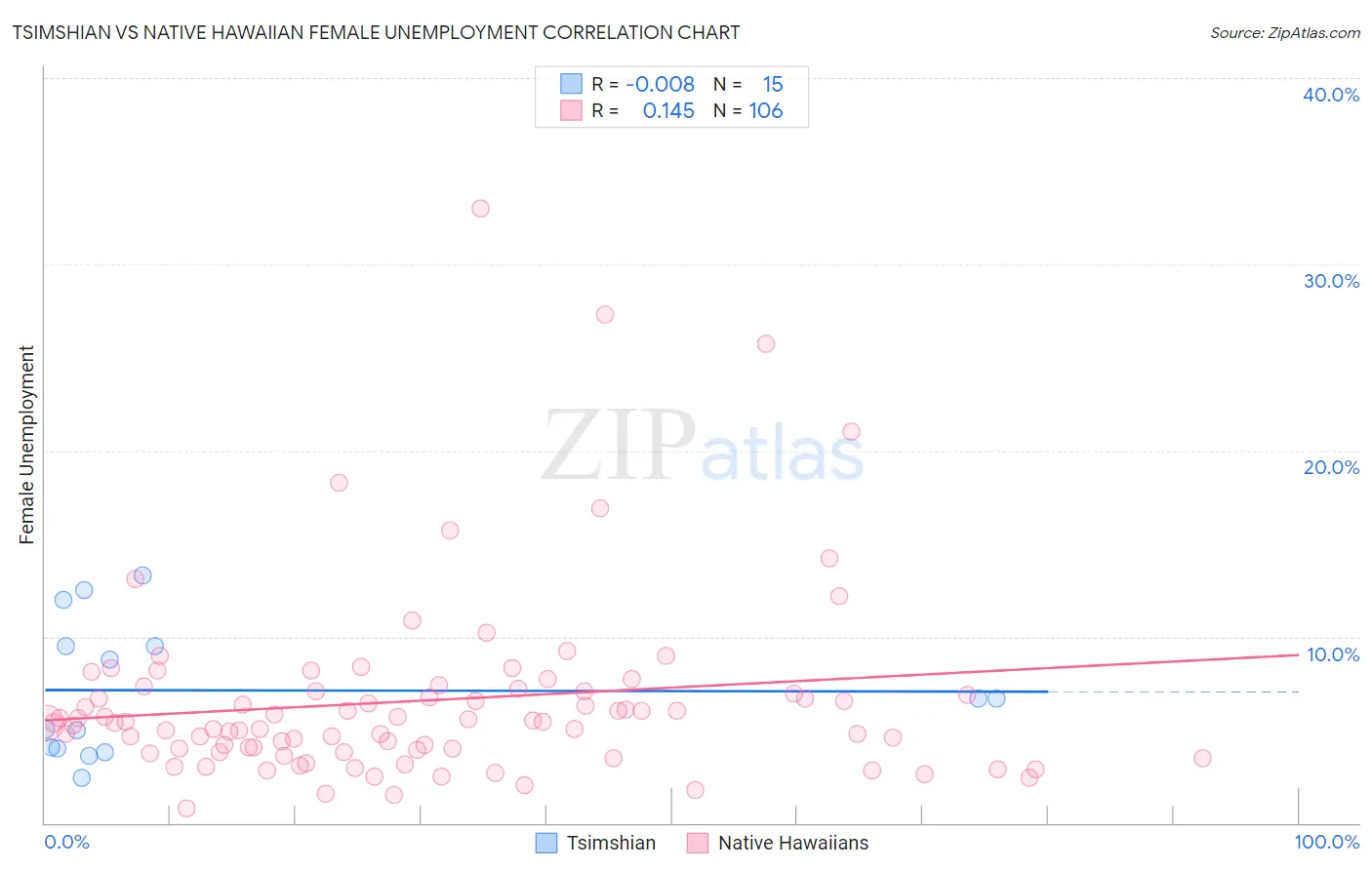 Tsimshian vs Native Hawaiian Female Unemployment Correlation Chart