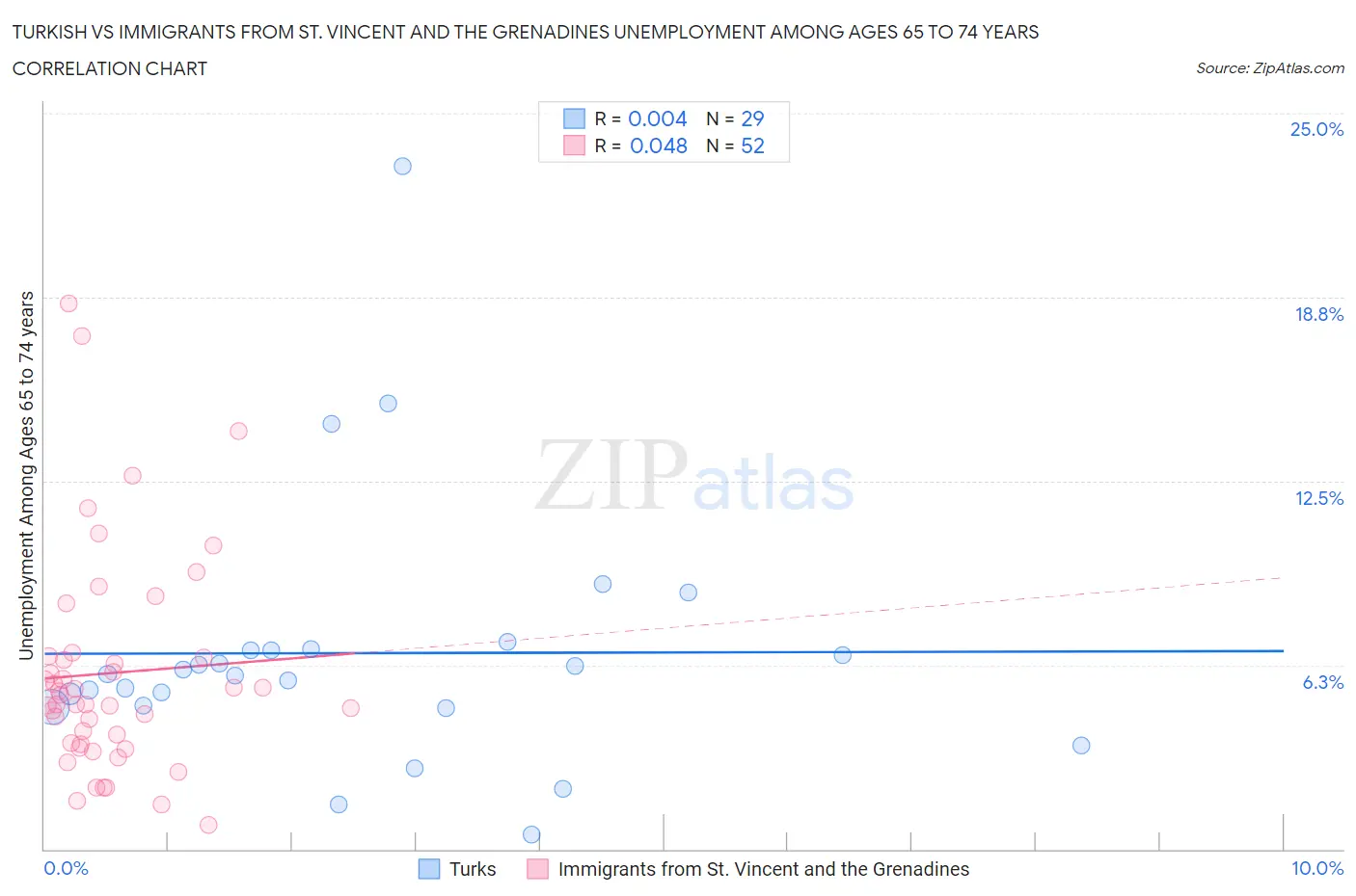 Turkish vs Immigrants from St. Vincent and the Grenadines Unemployment Among Ages 65 to 74 years Correlation Chart