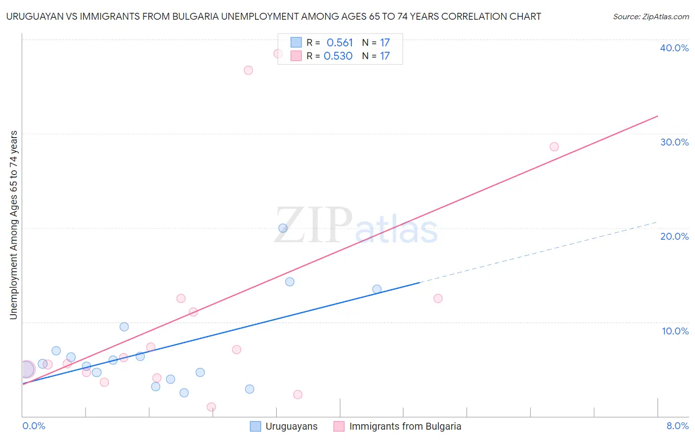Uruguayan vs Immigrants from Bulgaria Unemployment Among Ages 65 to 74 years Correlation Chart