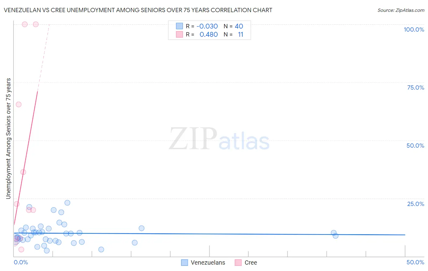 Venezuelan vs Cree Unemployment Among Seniors over 75 years Correlation Chart