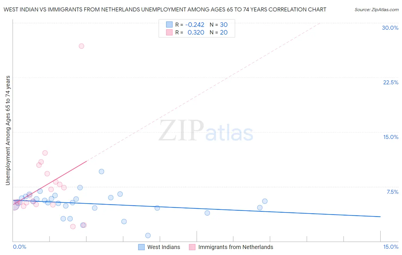 West Indian vs Immigrants from Netherlands Unemployment Among Ages 65 to 74 years Correlation Chart