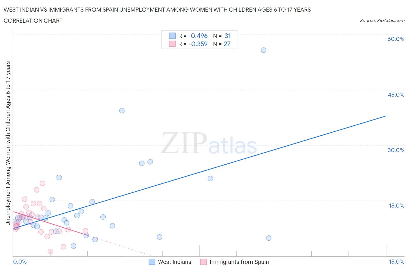 West Indian vs Immigrants from Spain Unemployment Among Women with Children Ages 6 to 17 years Correlation Chart