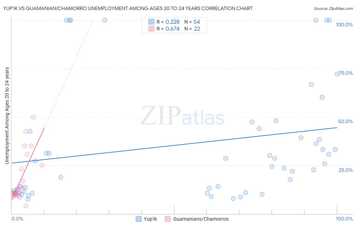 Yup'ik vs Guamanian/Chamorro Unemployment Among Ages 20 to 24 years Correlation Chart