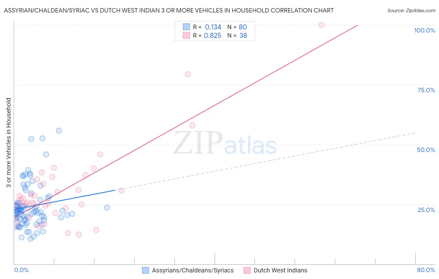 Assyrian/Chaldean/Syriac vs Dutch West Indian 3 or more Vehicles in Household Correlation Chart