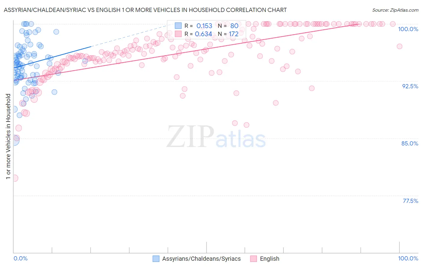 The statistical analysis conducted on geographies consisting of 110,295,152 people shows a poor positive correlation between the proportion of Assyrians/Chaldeans/Syriacs and percentage of households with 1 or more vehicles available in the United States with a correlation coefficient (R) of 0.153 and weighted average of 93.0%. Similarly, the statistical analysis conducted on geographies consisting of 556,750,813 people shows a significant positive correlation between the proportion of English and percentage of households with 1 or more vehicles available in the United States with a correlation coefficient (R) of 0.634 and weighted average of 93.8%, a difference of 0.83%.