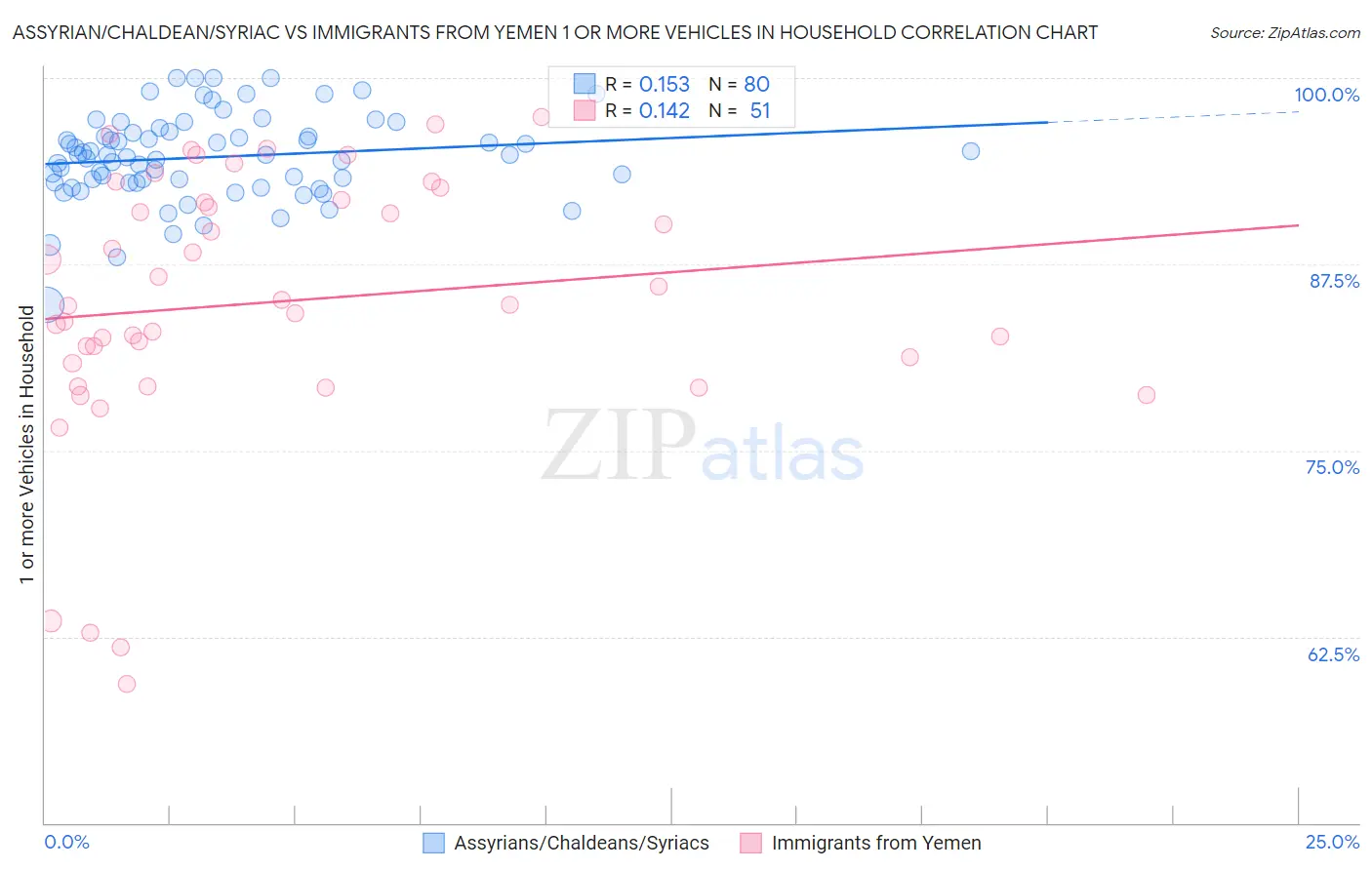 Assyrian/Chaldean/Syriac vs Immigrants from Yemen 1 or more Vehicles in Household Correlation Chart