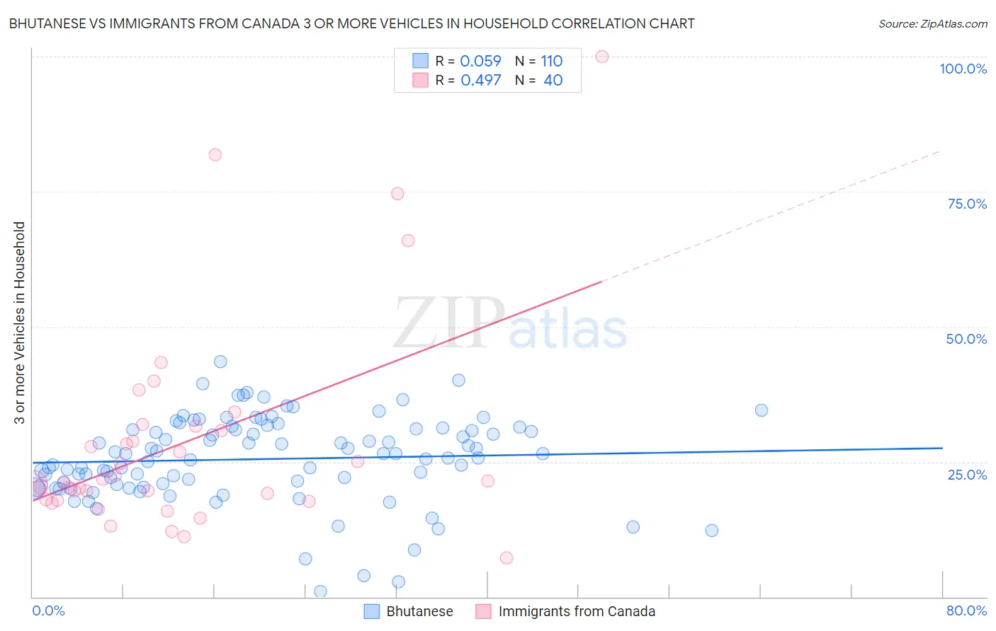 Bhutanese vs Immigrants from Canada 3 or more Vehicles in Household Correlation Chart
