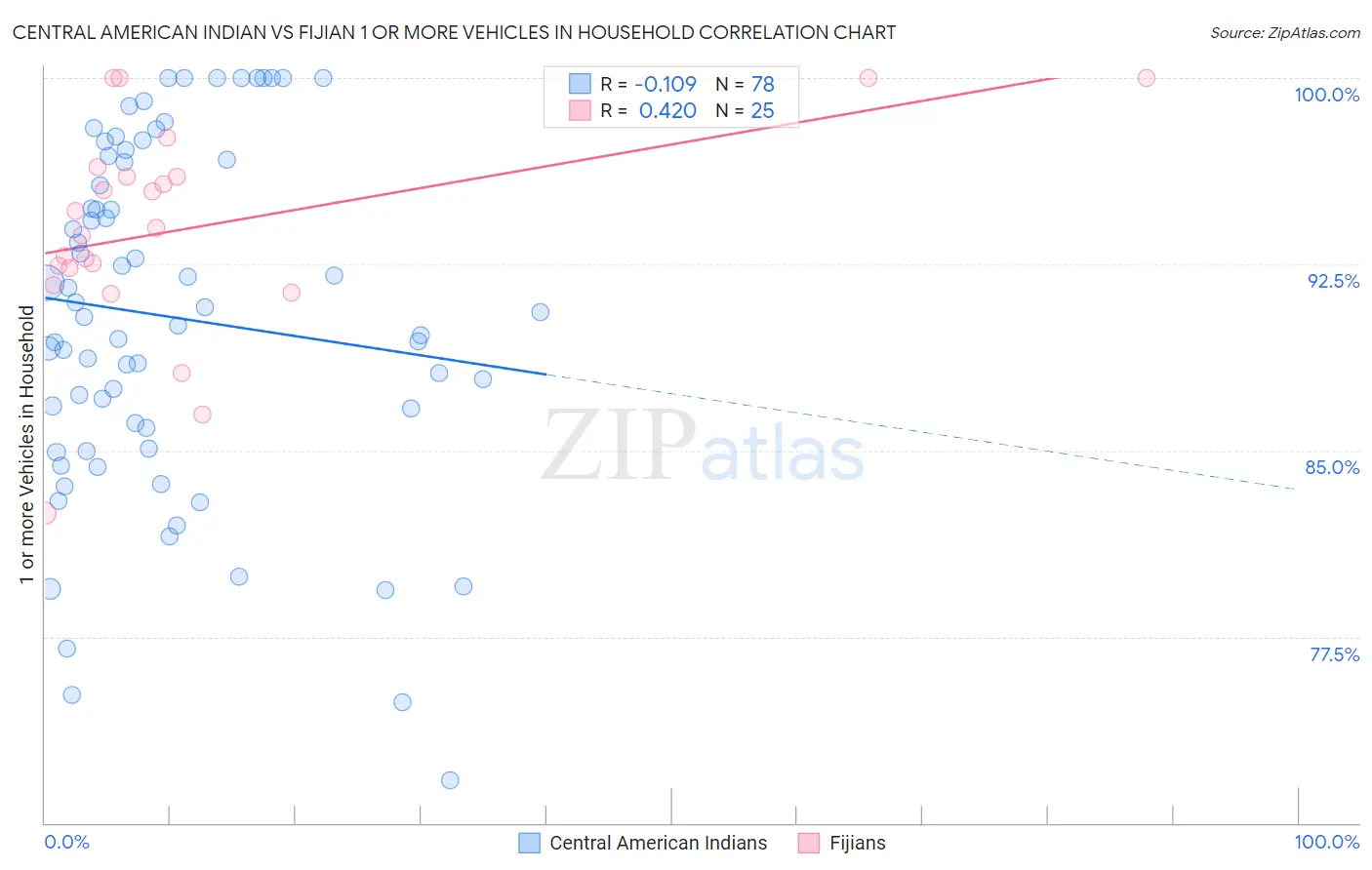 Central American Indian vs Fijian 1 or more Vehicles in Household Correlation Chart