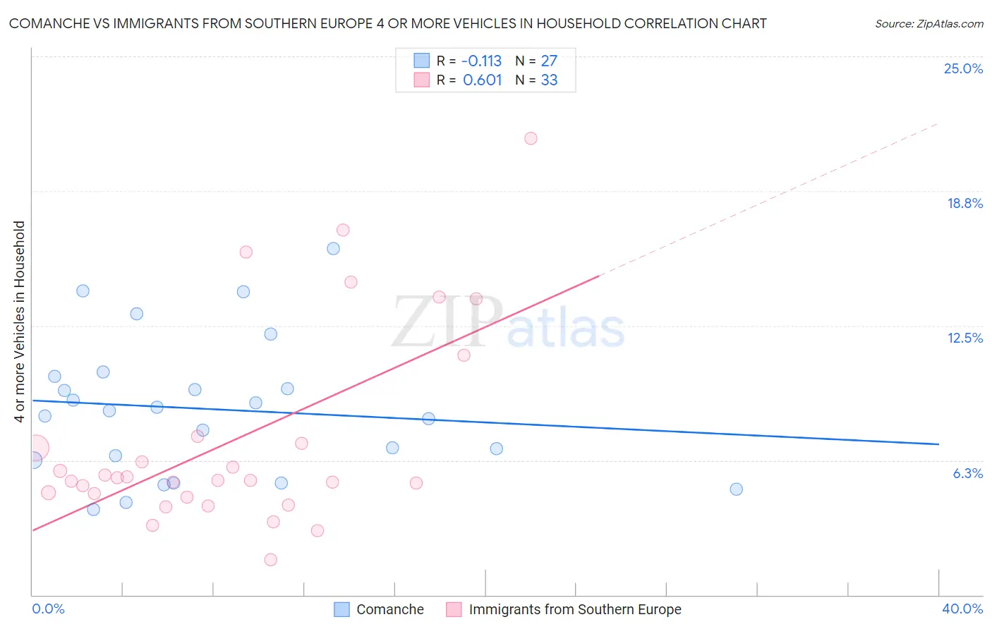 Comanche vs Immigrants from Southern Europe 4 or more Vehicles in Household Correlation Chart