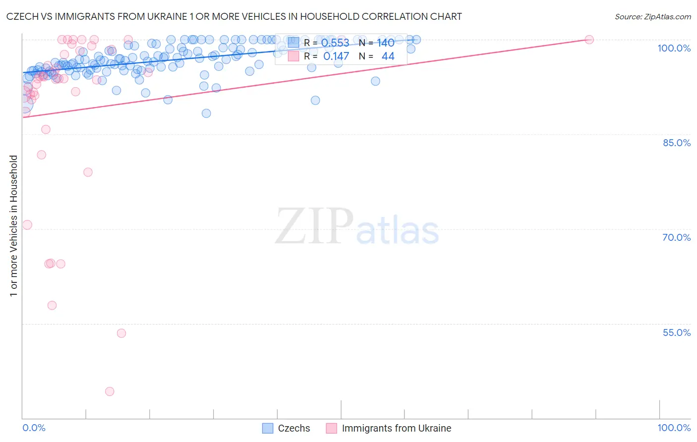 Czech vs Immigrants from Ukraine 1 or more Vehicles in Household Correlation Chart