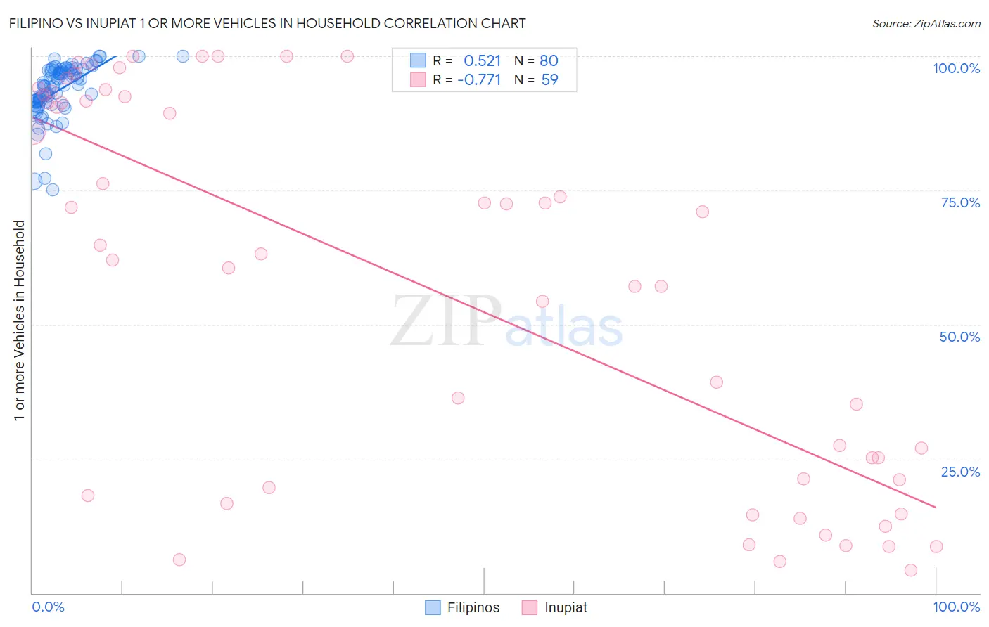 The statistical analysis conducted on geographies consisting of 254,177,454 people shows a substantial positive correlation between the proportion of Filipinos and percentage of households with 1 or more vehicles available in the United States with a correlation coefficient (R) of 0.521 and weighted average of 89.7%. Similarly, the statistical analysis conducted on geographies consisting of 96,318,712 people shows a strong negative correlation between the proportion of Inupiat and percentage of households with 1 or more vehicles available in the United States with a correlation coefficient (R) of -0.771 and weighted average of 71.5%, a difference of 25.4%.
