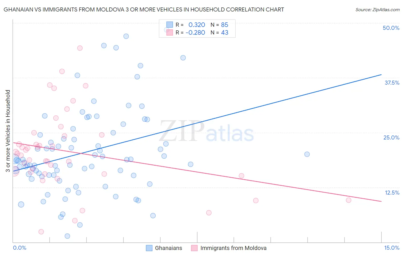 Ghanaian vs Immigrants from Moldova 3 or more Vehicles in Household Correlation Chart