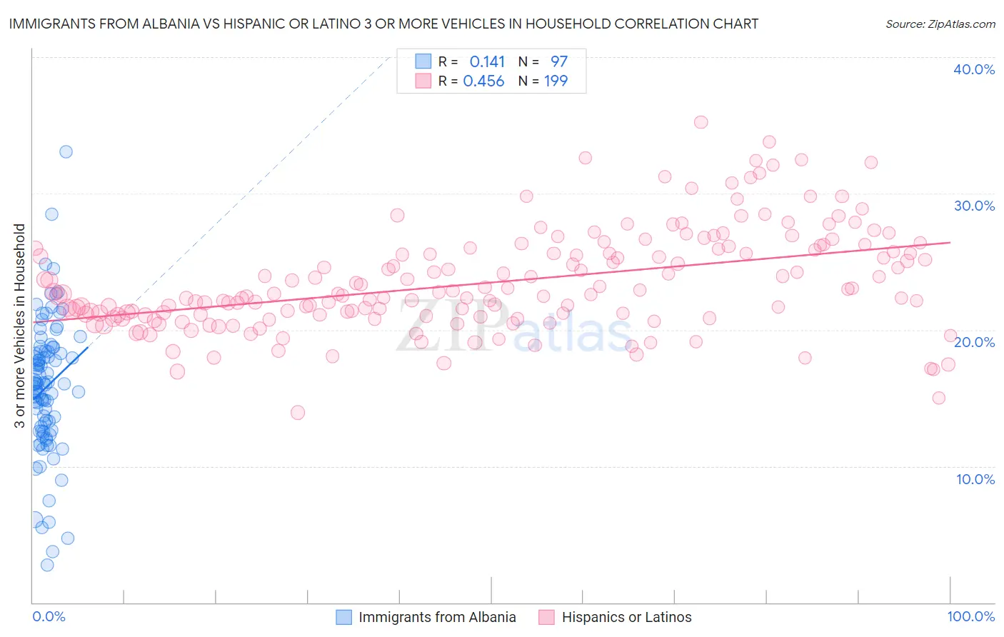 Immigrants from Albania vs Hispanic or Latino 3 or more Vehicles in Household Correlation Chart