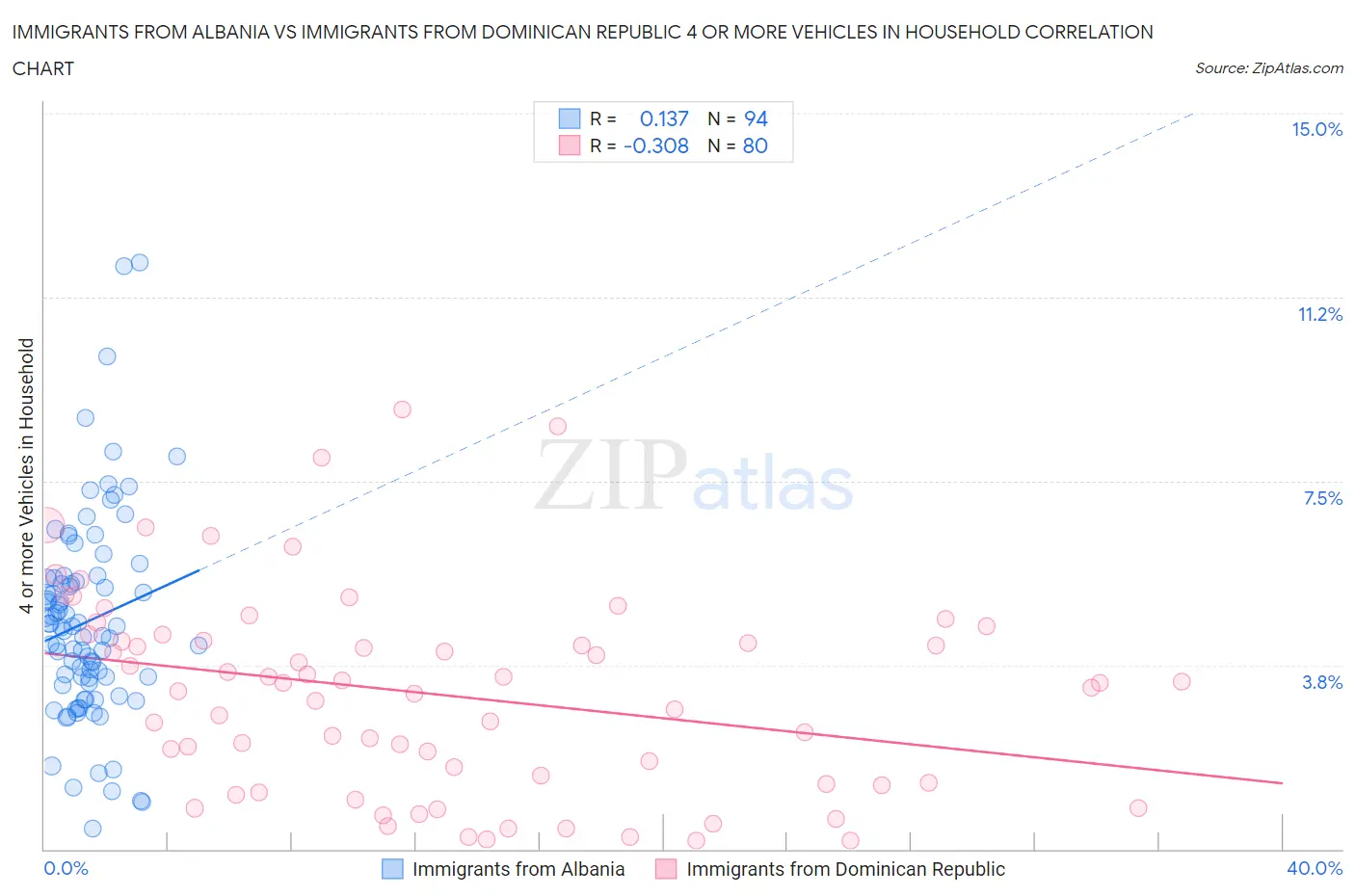 Immigrants from Albania vs Immigrants from Dominican Republic 4 or more Vehicles in Household Correlation Chart