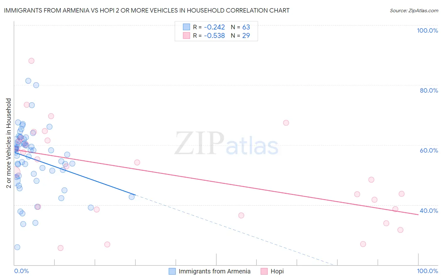 Immigrants from Armenia vs Hopi 2 or more Vehicles in Household Correlation Chart